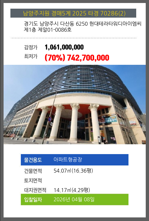 사건번호 2025 타경 70286(2) 본건은 경기도 남양주시 다산동 6250 현대테라타워디아이엠씨 제1층 제알01-0086호소재하는 아파트형공장경매 물건의 포스팅입니다. 건물면적 [ 54.07㎡ (16.36평) ]대지권 [ 14.17㎡ (4.29평) ] 시세를