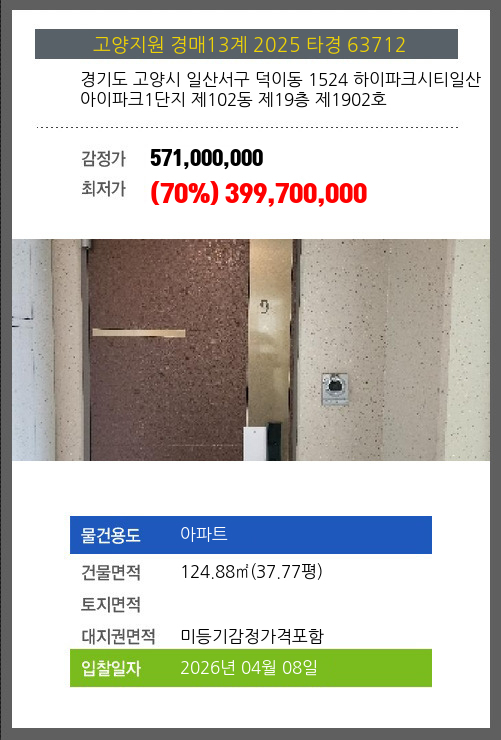 사건번호 2025 타경 63712 본건은 경기도 고양시 일산서구 덕이동 1524 하이파크시티일산아이파크1단지 제102동 제19층 제1902호소재하는 아파트경매 물건의 포스팅입니다. 건물면적 [ 124.88㎡ (37.77평) ]대지권 [ 미등기감정가격포함 ]
