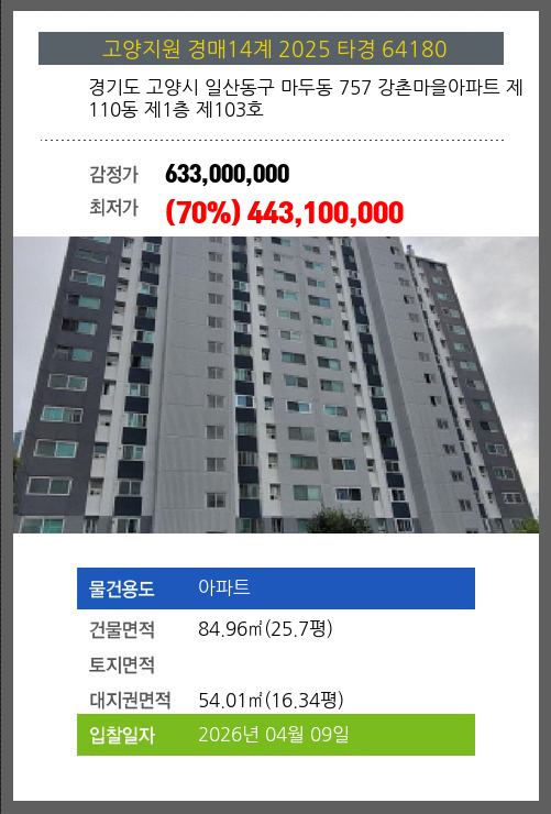 사건번호 2025 타경 64180 본건은 경기도 고양시 일산동구 마두동 757 강촌마을아파트 제110동 제1층 제103호소재하는 아파트경매 물건의 포스팅입니다. 건물면적 [ 84.96㎡ (25.7평) ]대지권 [ 54.01㎡ (16.34평)