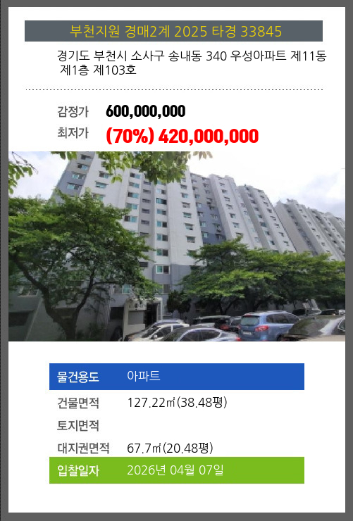 사건번호 2025 타경 33845 본건은 경기도 부천시 소사구 송내동 340 우성아파트 제11동 제1층 제103호소재하는 아파트경매 물건의 포스팅입니다. 건물면적 [ 127.22㎡ (38.48평) ]대지권 [ 67.7㎡ (20.48평)