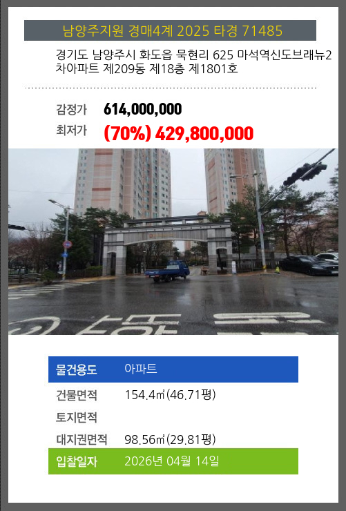 사건번호 2025 타경 71485 본건은 경기도 남양주시 화도읍 묵현리 625 마석역신도브래뉴2차아파트 제209동 제18층 제1801호소재하는 아파트경매 물건의 포스팅입니다. 건물면적 [ 154.4㎡ (46.71평) ]대지권 [ 98.56㎡ (29.81평)