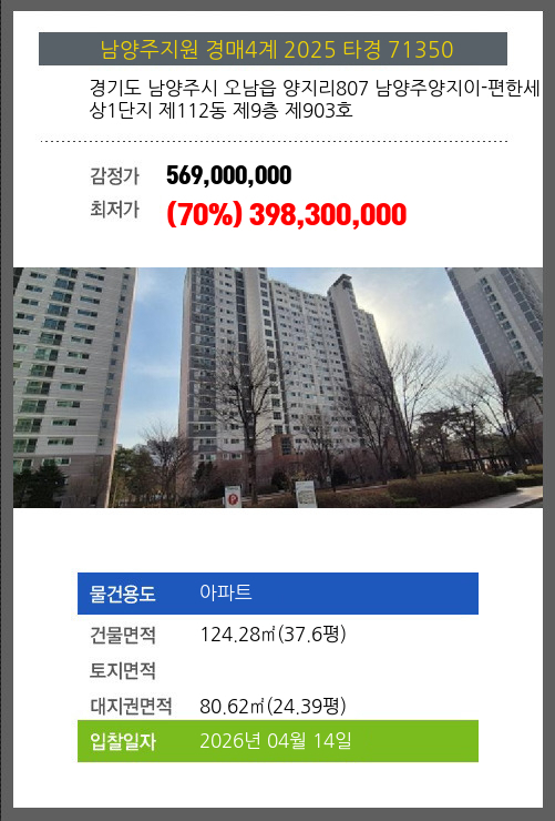 사건번호 2025 타경 71350 본건은 경기도 남양주시 오남읍 양지리807 남양주양지이-편한세상1단지 제112동 제9층 제903호소재하는 아파트경매 물건의 포스팅입니다. 건물면적 [ 124.28㎡ (37.6평) ]대지권 [ 80.62㎡ (24.39평) ]