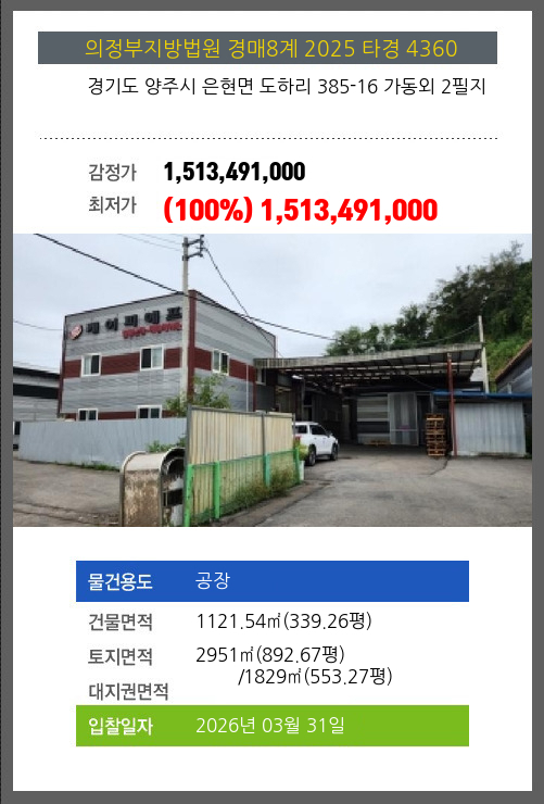 사건번호 2025 타경 4360 본건은 경기도 양주시 은현면 도하리 385-16 가동외 2필지소재하는 공장경매 물건의 포스팅입니다. 건물면적 [ 1121.54㎡ (339.26평) ]토지면적 [ 전체:2951㎡ (892.67평) 매각지분:1829㎡ (553.27평)