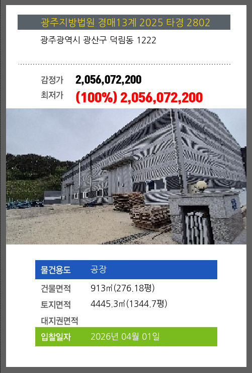 사건번호 2025 타경 2802 본건은 광주광역시 광산구 덕림동 1222소재하는 공장경매 물건의 포스팅입니다. 건물면적 [ 913㎡ (276.18평) ]토지면적 [ 4445.3㎡ (1344.7평) ] 시세를 반영한 감정가 2,056,072,200에서신건으로