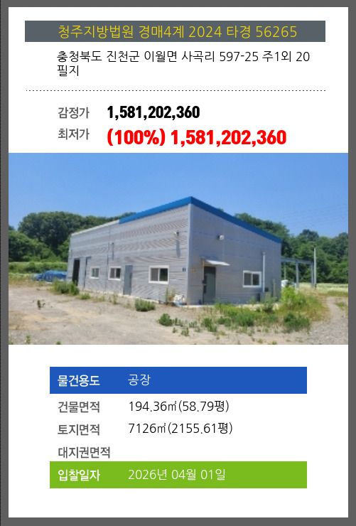 사건번호 2024 타경 56265 본건은 충청북도 진천군 이월면 사곡리 597-25 주1외 20필지소재하는 공장경매 물건의 포스팅입니다. 건물면적 [ 194.36㎡ (58.79평) ]토지면적 [ 7126㎡ (2155.61평) ] 시세를