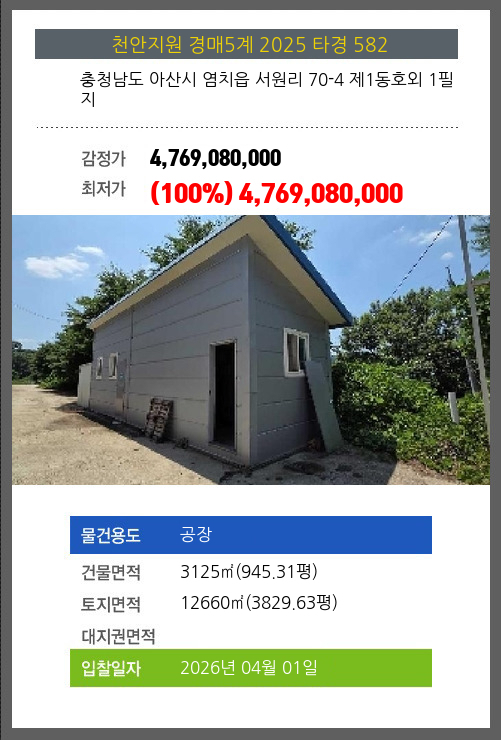 사건번호 2025 타경 582 본건은 충청남도 아산시 염치읍 서원리 70-4 제1동호외 1필지소재하는 공장경매 물건의 포스팅입니다. 건물면적 [ 3125㎡ (945.31평) ]토지면적 [ 12660㎡ (3829.63평) ] 시세를