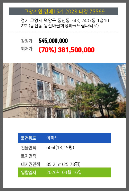 사건번호 2023 타경 75569 본건은 경기 고양시 덕양구 동산동 343, 2407동 1층102호 (동산동,동산마을화성파크드림파티오)소재하는 아파트경매 물건의 포스팅입니다. 건물면적 [ 60㎡ (18.15평) ]대지권 [ 85.21㎡ (25.78평) ]
