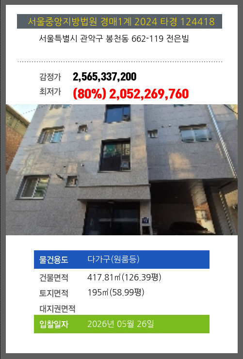 사건번호 2025 타경 213(1) 본건은 강원특별자치도 원주시 단구동 1682-1 현진에버빌5차 제502동 제3층 제303호소재하는 아파트경매 물건의 포스팅입니다. 건물면적 [ 126.57㎡ (38.29평) ]대지권 [ 79.82㎡ (24.14평) ]