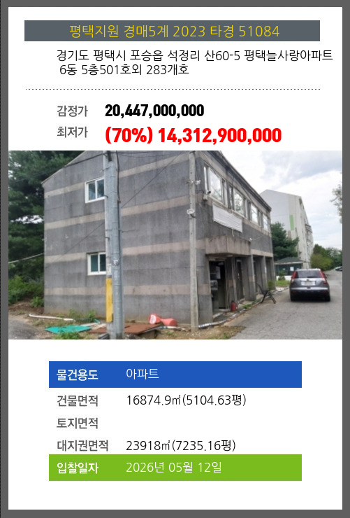 사건번호 2024 타경 69284 본건은 경기도 광주시 도척면 상림리 24-4소재하는 창고경매 물건의 포스팅입니다. 건물면적 [ 2390.36㎡ (723.08평) ]토지면적 [ 1575㎡ (476.44평) ] 시세를 반영한 감정가