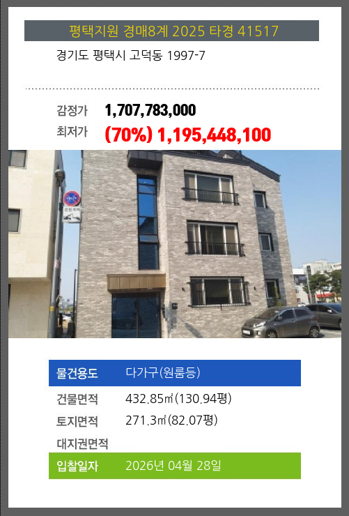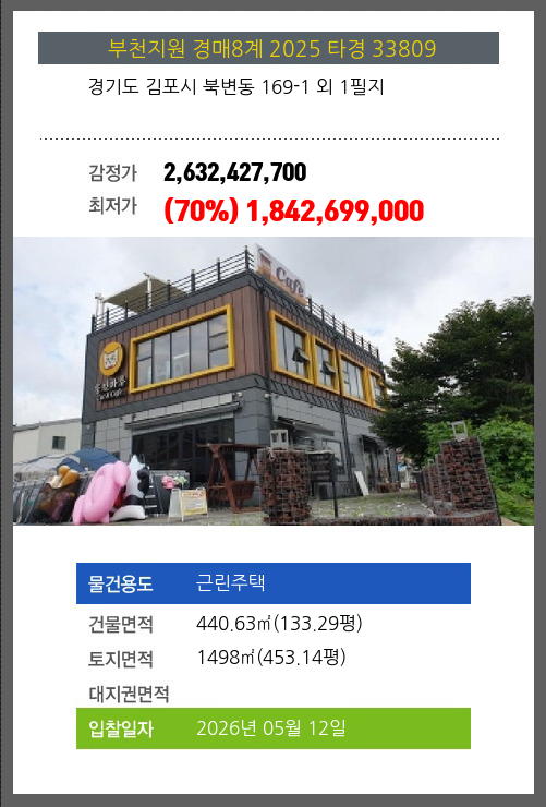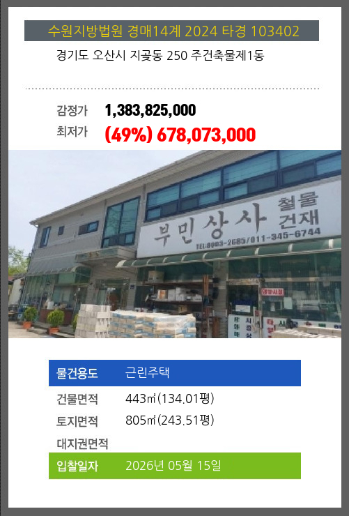 사건번호 2025 타경 41769 본건은 경기도 안성시 원곡면 내가천리 111-3 주1동외 3필지소재하는 근린시설경매 물건의 포스팅입니다. 건물면적 [ 334.25㎡ (101.11평) ]토지면적 [ 1842㎡ (557.2평) ] 시세를