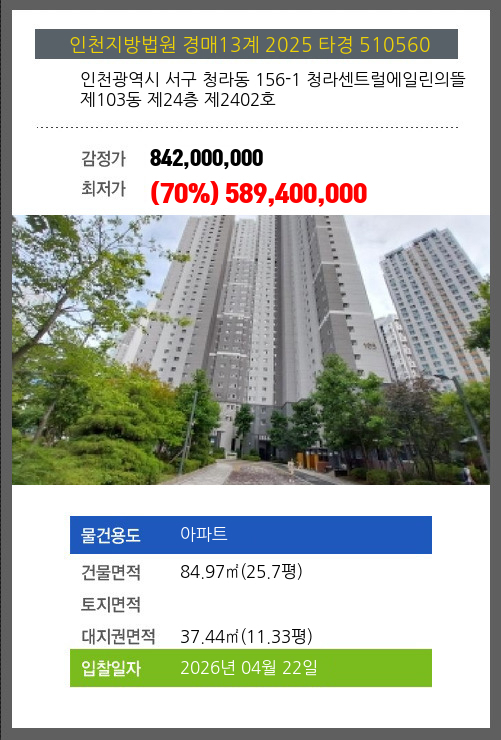 사건번호 2025 타경 510560 본건은 인천광역시 서구 청라동 156-1 청라센트럴에일린의뜰 제103동 제24층 제2402호소재하는 아파트경매 물건의 포스팅입니다. 건물면적 [ 84.97㎡ (25.7평) ]대지권 [ 37.44㎡ (11.33평) ]