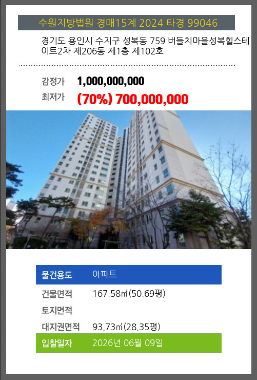 사건번호 2024 타경 99046 본건은 경기도 용인시 수지구 성복동 759 버들치마을성복힐스테이트2차 제206동 제1층 제102호소재하는 아파트경매 물건의 포스팅입니다. 건물면적 [ 167.58㎡ (50.69평) ]대지권 [ 93.73㎡ (28.35평)