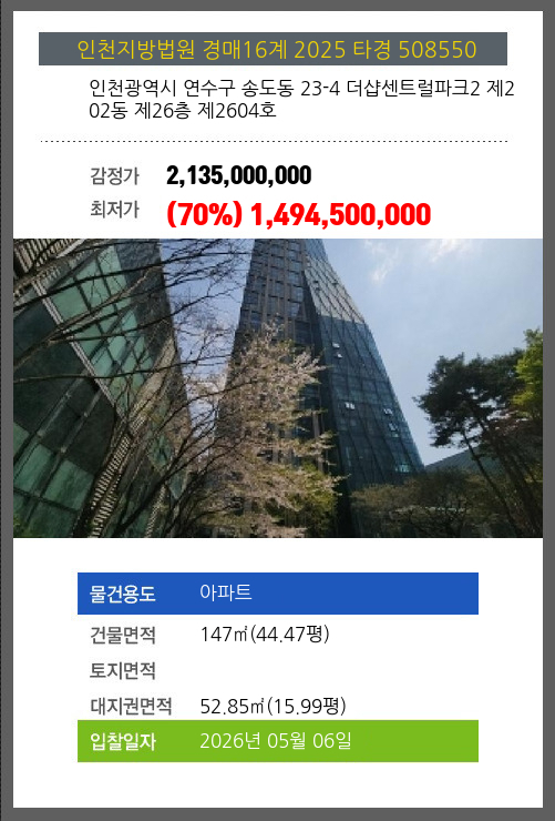 사건번호 2025 타경 508550 본건은 인천광역시 연수구 송도동 23-4 더샵센트럴파크2 제202동 제26층 제2604호소재하는 아파트경매 물건의 포스팅입니다. 건물면적 [ 147㎡ (44.47평) ]대지권 [ 52.85㎡ (15.99평) ]