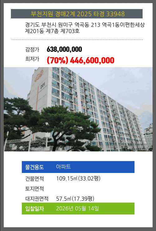 사건번호 2025 타경 33948 본건은 경기도 부천시 원미구 역곡동 213 역곡1동이편한세상 제201동 제7층 제703호소재하는 아파트경매 물건의 포스팅입니다. 건물면적 [ 109.15㎡ (33.02평) ]대지권 [ 57.5㎡ (17.39평)