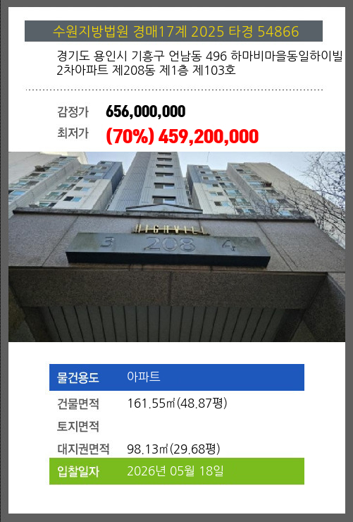 사건번호 2025 타경 54866 본건은 경기도 용인시 기흥구 언남동 496 하마비마을동일하이빌2차아파트 제208동 제1층 제103호소재하는 아파트경매 물건의 포스팅입니다. 건물면적 [ 161.55㎡ (48.87평) ]대지권 [ 98.13㎡ (29.68평)