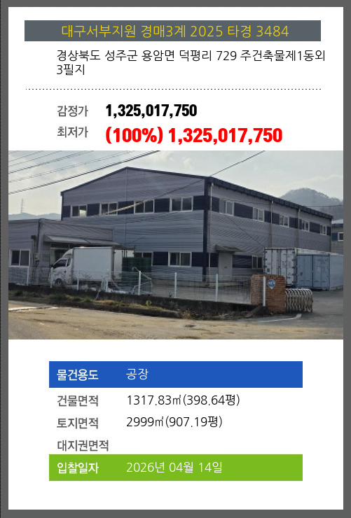 사건번호 2025 타경 3484 본건은 경상북도 성주군 용암면 덕평리 729 주건축물제1동외 3필지소재하는 공장경매 물건의 포스팅입니다. 건물면적 [ 1317.83㎡ (398.64평) ]토지면적 [ 2999㎡ (907.19평) ] 시세를