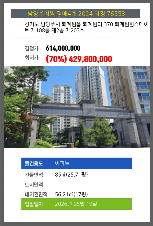 사건번호 2024 타경 76553 본건은 경기도 남양주시 퇴계원읍 퇴계원리 370 퇴계원힐스테이트 제108동 제2층 제203호소재하는 아파트경매 물건의 포스팅입니다. 건물면적 [ 85㎡ (25.71평) ]대지권 [ 56.21㎡ (17평)