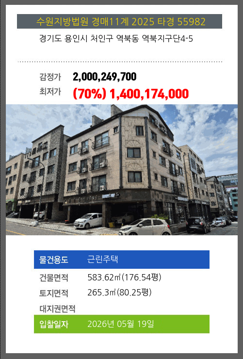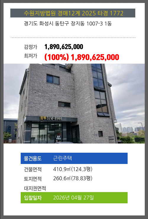 사건번호 2025 타경 55038 본건은 경기도 용인시 수지구 성복동 767 버들치마을 성복자이2차 제207동 제1층 제103호소재하는 아파트경매 물건의 포스팅입니다. 건물면적 [ 179.99㎡ (54.45평) ]대지권 [ 100.96㎡