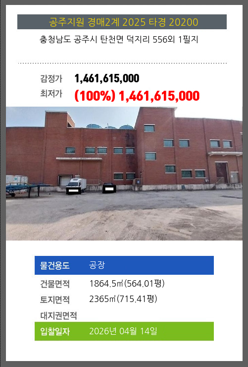 사건번호 2025 타경 20200 본건은 충청남도 공주시 탄천면 덕지리 556외 1필지소재하는 공장경매 물건의 포스팅입니다. 건물면적 [ 1864.5㎡ (564.01평) ]토지면적 [ 2365㎡ (715.41평) ] 시세를 반영한