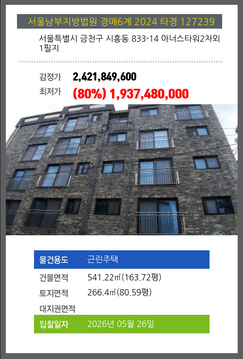 사건번호 2024 타경 114033 본건은 부산광역시 남구 용호동 424-6 내제조표가116호소재하는 주택경매 물건의 포스팅입니다. 건물면적 [ 167.83㎡ (50.77평) ]토지면적 [ 132.2㎡ (39.99평) ] 시세를 반영한 감정가