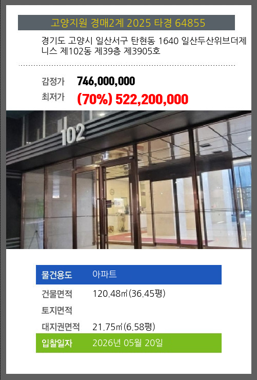 사건번호 2025 타경 64855 본건은 경기도 고양시 일산서구 탄현동 1640 일산두산위브더제니스 제102동 제39층 제3905호소재하는 아파트경매 물건의 포스팅입니다. 건물면적 [ 120.48㎡ (36.45평) ]대지권 [ 21.75㎡ (6.58평)