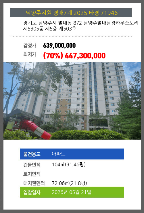 사건번호 2025 타경 71946 본건은 경기도 남양주시 별내동 872 남양주별내남광하우스토리 제5305동 제5층 제503호소재하는 아파트경매 물건의 포스팅입니다. 건물면적 [ 104㎡ (31.46평) ]대지권 [ 72.06㎡ (21.8평) ]