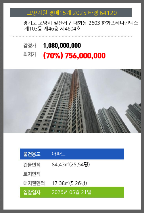 사건번호 2025 타경 64120 본건은 경기도 고양시 일산서구 대화동 2603 한화포레나킨텍스 제103동 제46층 제4604호소재하는 아파트경매 물건의 포스팅입니다. 건물면적 [ 84.43㎡ (25.54평) ]대지권 [ 17.38㎡ (5.26평)