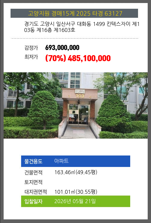 사건번호 2025 타경 63127 본건은 경기도 고양시 일산서구 대화동 1499 킨텍스자이 제103동 제16층 제1603호소재하는 아파트경매 물건의 포스팅입니다. 건물면적 [ 163.46㎡ (49.45평) ]대지권 [ 101.01㎡ (30.55평)