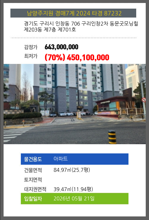 사건번호 2024 타경 87232 본건은 경기도 구리시 인창동 706 구리인창2차 동문굿모닝힐 제203동 제7층 제701호소재하는 아파트경매 물건의 포스팅입니다. 건물면적 [ 84.97㎡ (25.7평) ]대지권 [ 39.47㎡ (11.94평)