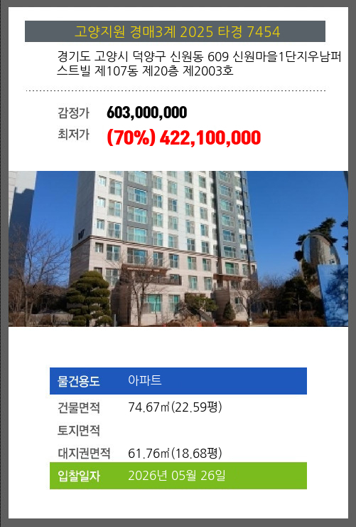 사건번호 2025 타경 7454 본건은 경기도 고양시 덕양구 신원동 609 신원마을1단지우남퍼스트빌 제107동 제20층 제2003호소재하는 아파트경매 물건의 포스팅입니다. 건물면적 [ 74.67㎡ (22.59평) ]대지권 [ 61.76㎡ (18.68평)