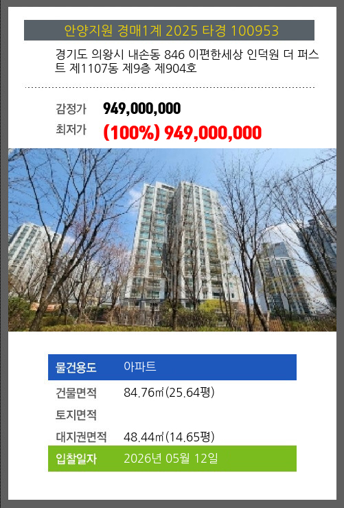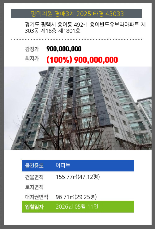 사건번호 2025 타경 1845 본건은 강원특별자치도 홍천군 남면 양덕원리 22-2 외 3필지소재하는 공장경매 물건의 포스팅입니다. 건물면적 [ 1423.33㎡ (430.56평) ]토지면적 [ 전체:12792㎡ (3869.56평) 매각지분:12217㎡ (3695.63평)