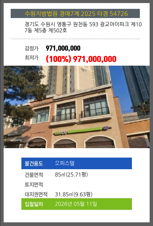 사건번호 2025 타경 33804 본건은 광주광역시 광산구 오선동 270-117 나동소재하는 공장경매 물건의 포스팅입니다. 건물면적 [ 1789.1㎡ (541.2평) ]토지면적 [ 2127.8㎡ (643.66평) ] 시세를 반영한 감정가
