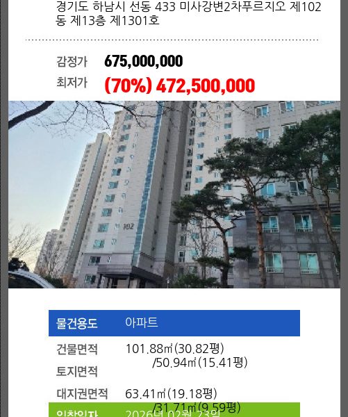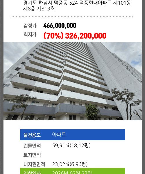 | 매각대상 | 건물만매각, 미납, 재매각, 법정지상권, 대항력있는임차인 | 경매종류 | 강제경매 | 사건접수일 | 2022-05-30 |