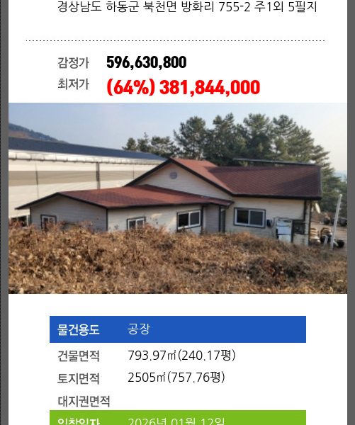 하동공장경매 하동군 진교면 안심리 산48 주1외 5필지 №2023 타경 34677