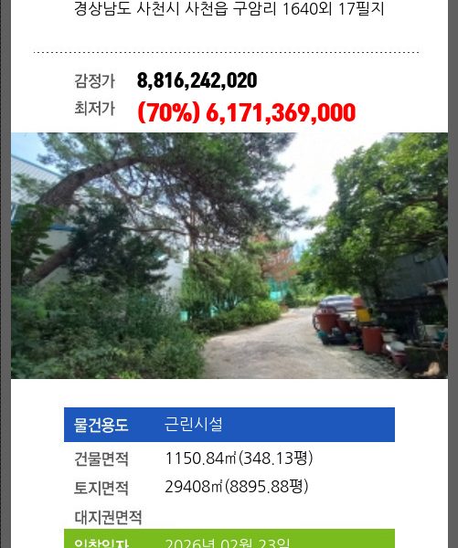 | 토지면적 | 13042㎡ (3945.19평) | 소유자 | 블** | 보증금 | (10%) 270,001,700 |