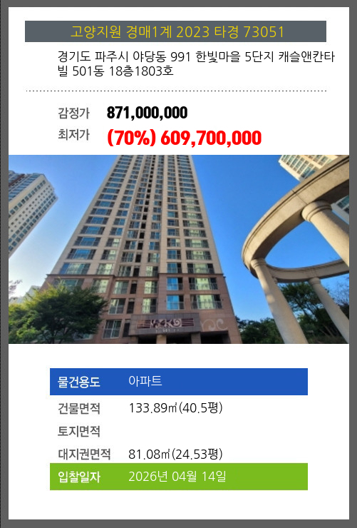 본건은 경기도 파주시 야당동 991 한빛마을 5단지 캐슬앤칸타빌 501동 18층1803호