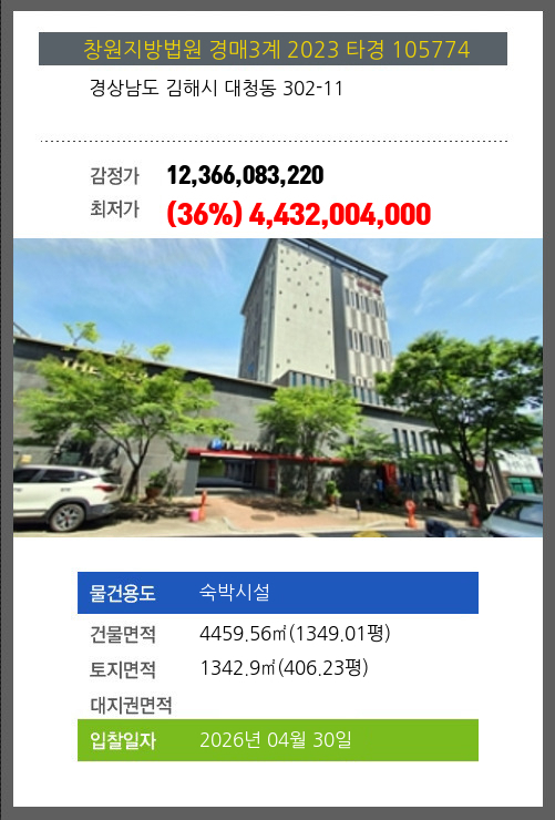 | 건물면적 | 4459.56㎡ (1349.01평) | 채무자 | 더** | 최저가 | (36%) 4,432,004,000 |
