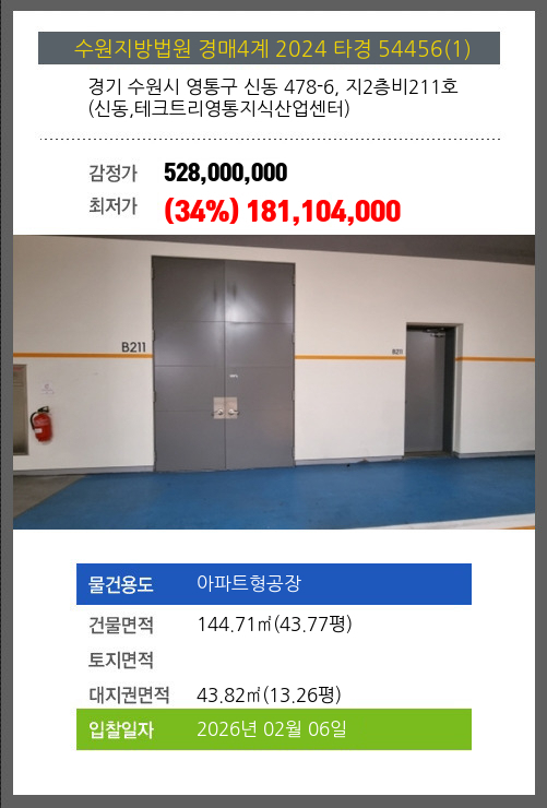 본건은 경기 수원시 영통구 신동 478-6, 지2층비211호 (신동,테크트리영통지식산업센터)