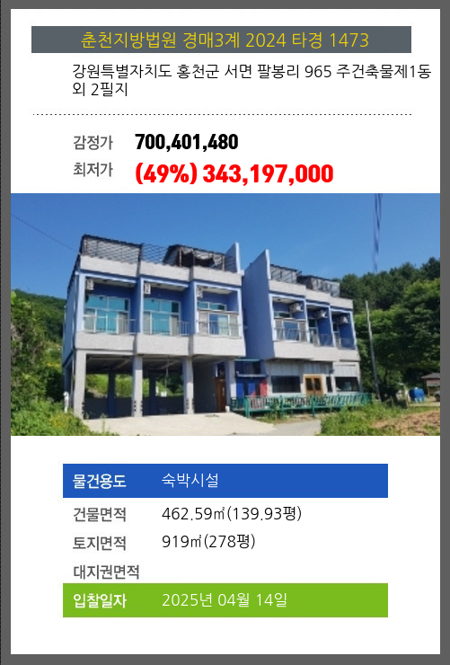 | 소재지 | [지번] 강원특별자치도 홍천군 서면 팔봉리 965 주건축물제1동외 2필지 [도로명 주소] 강원도 홍천군 서면 팔봉강변길 141 주건축물제1동 |