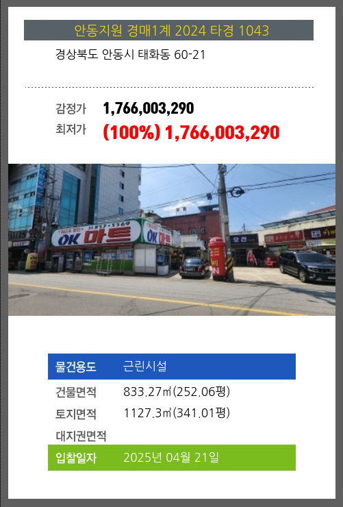 | 용도 | 근린시설 | 채권자 | 안** | 감정가 | 1,766,003,290 |