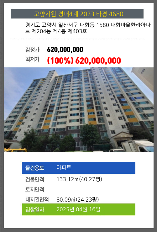 | 용도 | 아파트 | 채권자 | 비**외1명 | 감정가 | 620,000,000 |