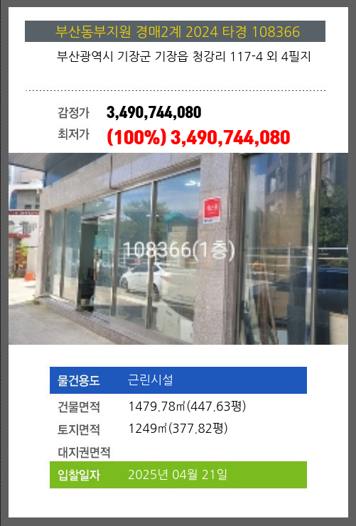 | 소재지 | [지번] 부산광역시 기장군 기장읍 청강리 117-4 외 4필지 [도로명 주소] 부산광역시 기장군 기장읍 기장대로 482-8 |