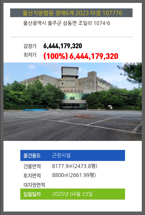| 건물면적 | 8177.9㎡ (2473.8평) | 채무자 | 통** | 최저가 | (100%) 6,444,179,320 |