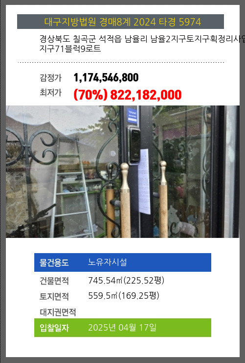| 건물면적 | 745.54㎡ (225.52평) | 채무자 | 김** | 최저가 | (70%) 822,182,000 |