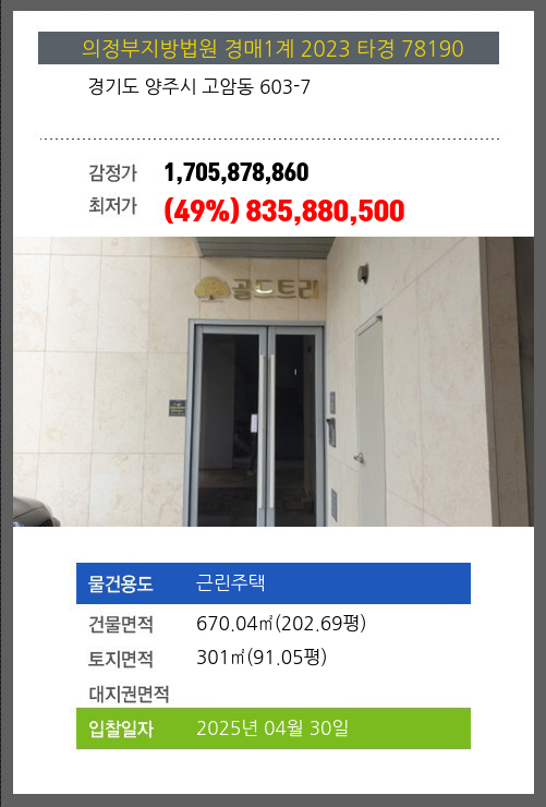 | 용도 | 근린주택 | 채권자 | 고** | 감정가 | 1,705,878,860 |