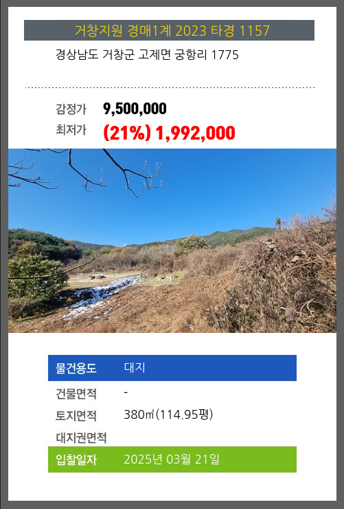 | 용도 | 대지 | 채권자 | 김** | 감정가 | 9,500,000 |
