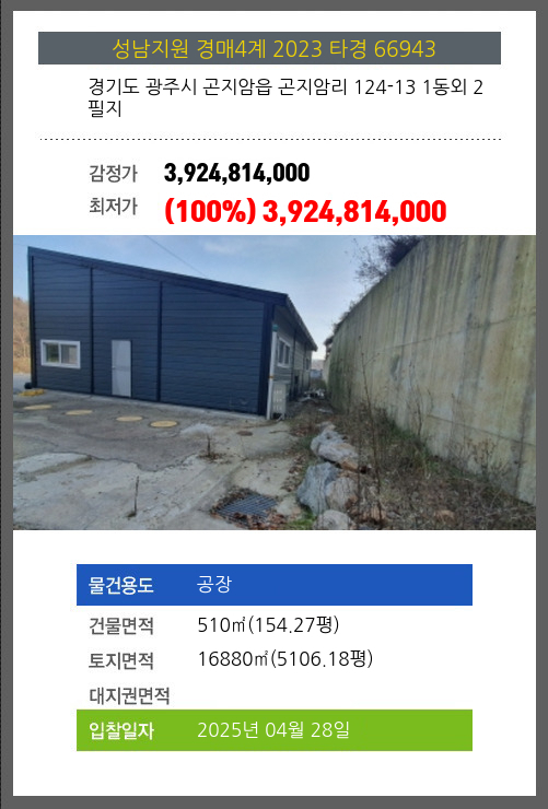 | 소재지 | [지번] 경기도 광주시 곤지암읍 곤지암리 124-13 1동외 2필지 [도로명 주소] 경기도 광주시 곤지암읍 광여로99번길 66 1동 |
