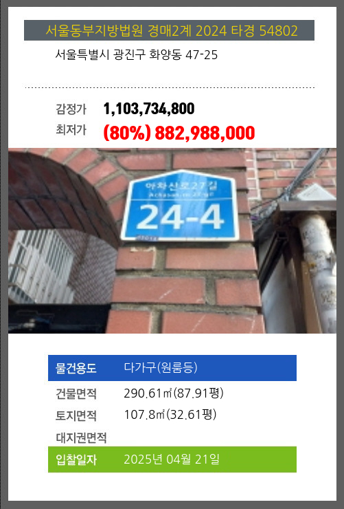 | 용도 | 다가구(원룸등) | 채권자 | 중** | 감정가 | 1,103,734,800 |