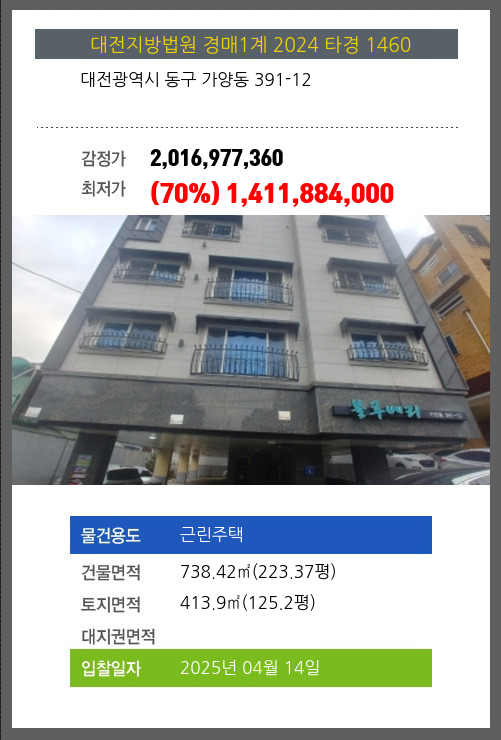 | 신건 | 2025-04-14 | 2,016,977,360 | 유찰 |