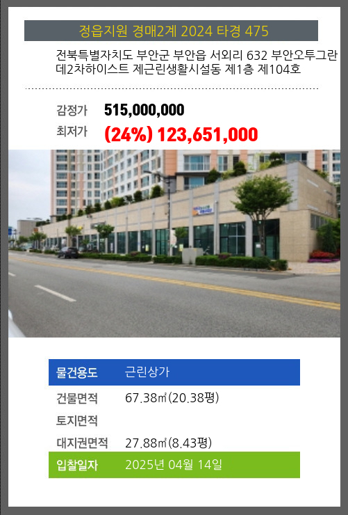 본건은 전북특별자치도 부안군 부안읍 서외리 632 부안오투그란데2차하이스트 제근린생활시설동 제1층 제104호